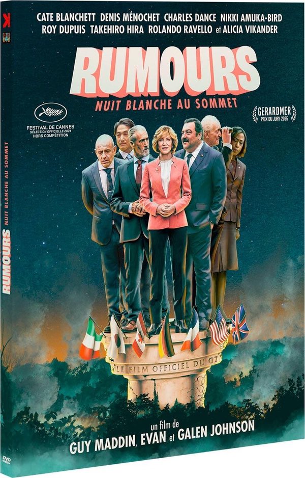 Réunis dans un château en Allemagne pour leur sommet annuel, les dirigeants des pays du G7 (États-Unis, Canada, France, Allemagne, Italie, Japon et Royaume-Uni) s’installent en bordure d’une forêt, dans une jolie gloriette, pour préparer leur déclaration. Mais l’ambiance n’est pas au beau fixe. Le premier ministre canadien n’arrive pas à oublier l’aventure qu’il a eu avec la première ministre britannique et surtout tout le monde autour de la table sait qu’il est pris dans un vilain scandale politico-financier. Inquiet, le groupe constate que le personnel autour d’eux a disparu. Le Canadien va s’isoler dans la forêt. Bientôt suivi par la chancelière allemande. Pour apaiser son confrère, elle lui propose un… massage qui s’achève en jeu de la bête à deux dos. Bientôt, un inquiétant grondement sort de la forêt… En voulant retrouver le personnel disparu, les sept politiciens s’enfoncent plus avant dans une forêt qui s’avère pleine de périls et de mystères. Si l’on excepte la présence notable du personnage du président américain dans le cinéma hollywoodien, l’homme politique n’est pas récurrent sur le grand écran. Rumours, nuit blanche au sommet a donc d’emblée l’attrait d’une satire géopolitique qui, de plus, ne craint pas de s’aventurer sur le terrain du fantastique. Contraints, disent-ils, par la catastrophe imminente qui nous est désormais que trop familière, Guy Maddin, Galen Johnson et Evan Johnson, trio à l’imagination fertile, signent un film dont on est en droit de se demander s’il s’agit bien d’une… comédie. Car l’on voit des gens de pouvoir perdre complètement pied alors qu’on pourrait peut-être attendre d’eux une capacité à se grandir dans la crise. Il est vrai que leur nuit en forêt va devenir de plus en plus vertigineuse avec la rencontre de corps momifiés datant de l’Age de fer, d’un cerveau géant ou de zombies… Mais Rumours ne parvient pas à nous captiver complètement. Bien sûr, les comédiens, Cate Blanchett, Charles Dance, Denis Ménochet en tête, sont bons mais on demeure à l’extérieur de cette farce qui charrie, in fine, trop de grain à moudre… (Potemkine)